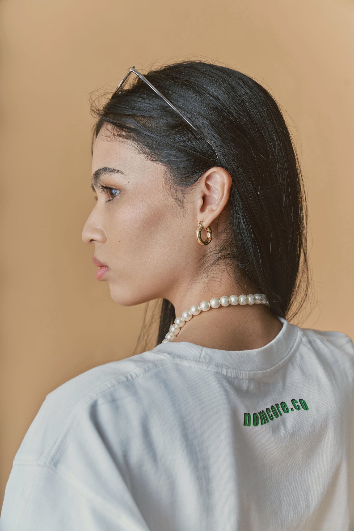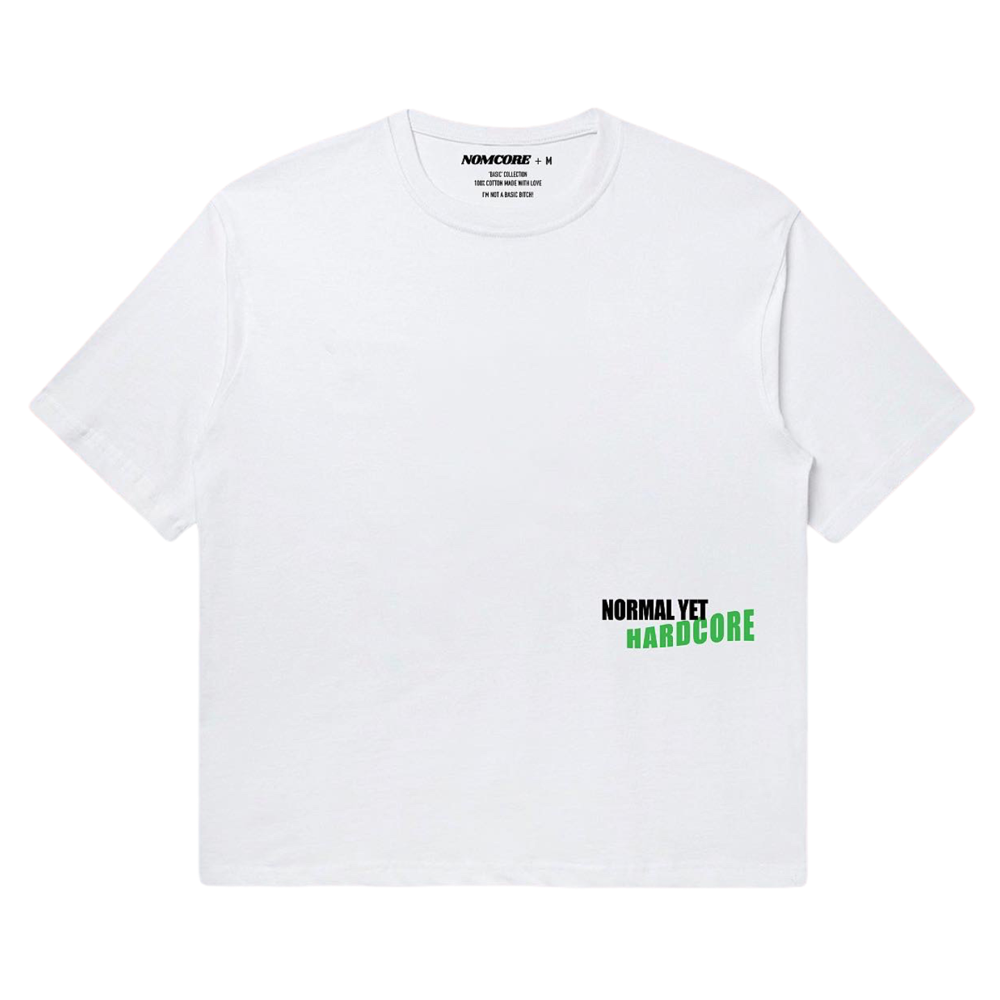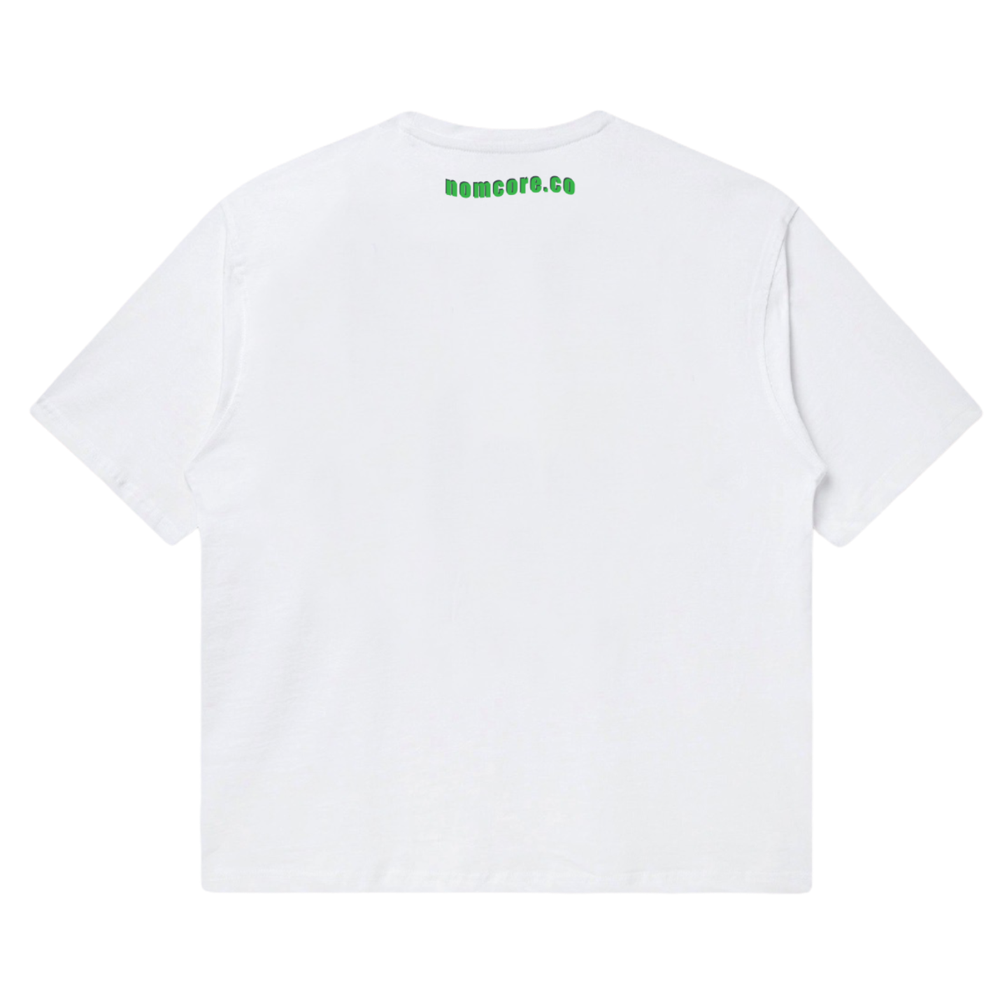 White oversized fit T-shirt made of 100% cotton material. With our tagline printed on the front and our website on the back.