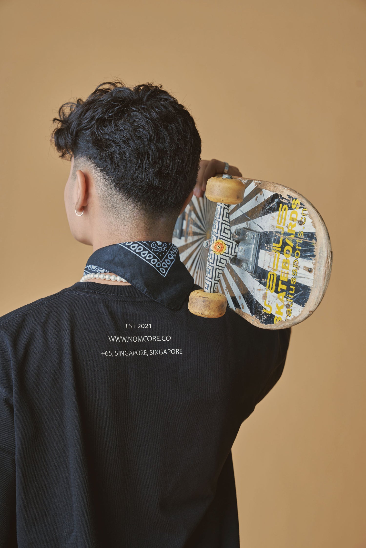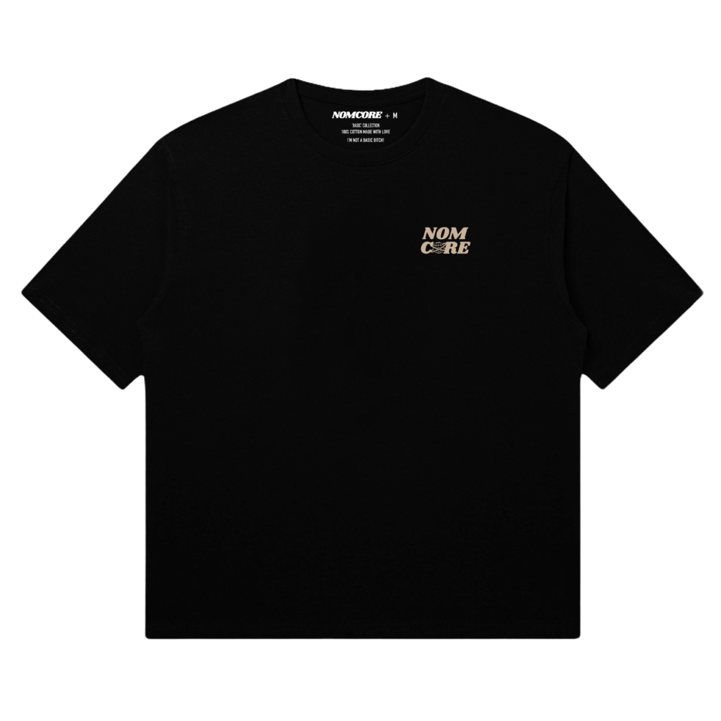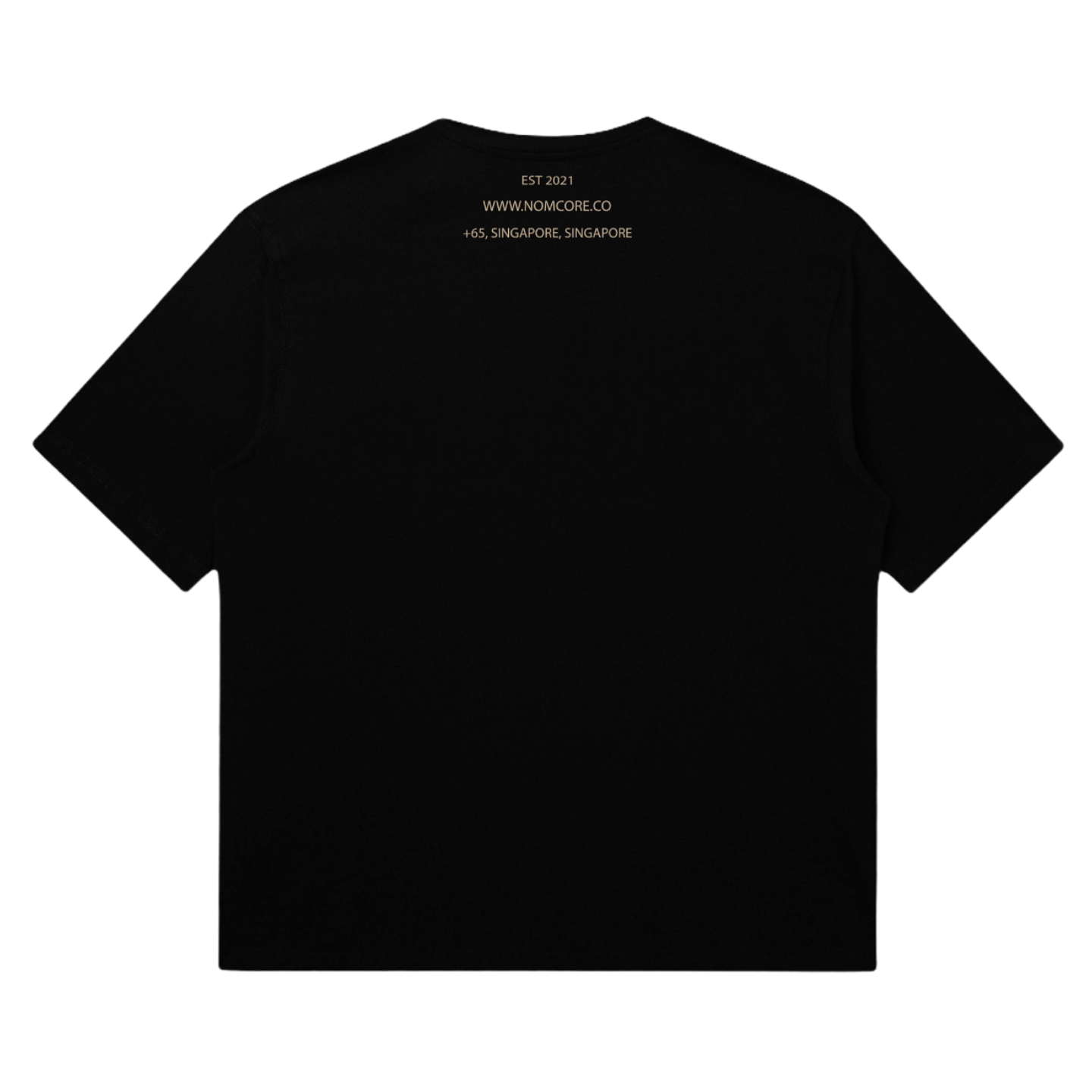 Black oversized fit T-shirt made of 100% cotton material. With Nomcore's printed on the side and our our brand website/country origin on the back.