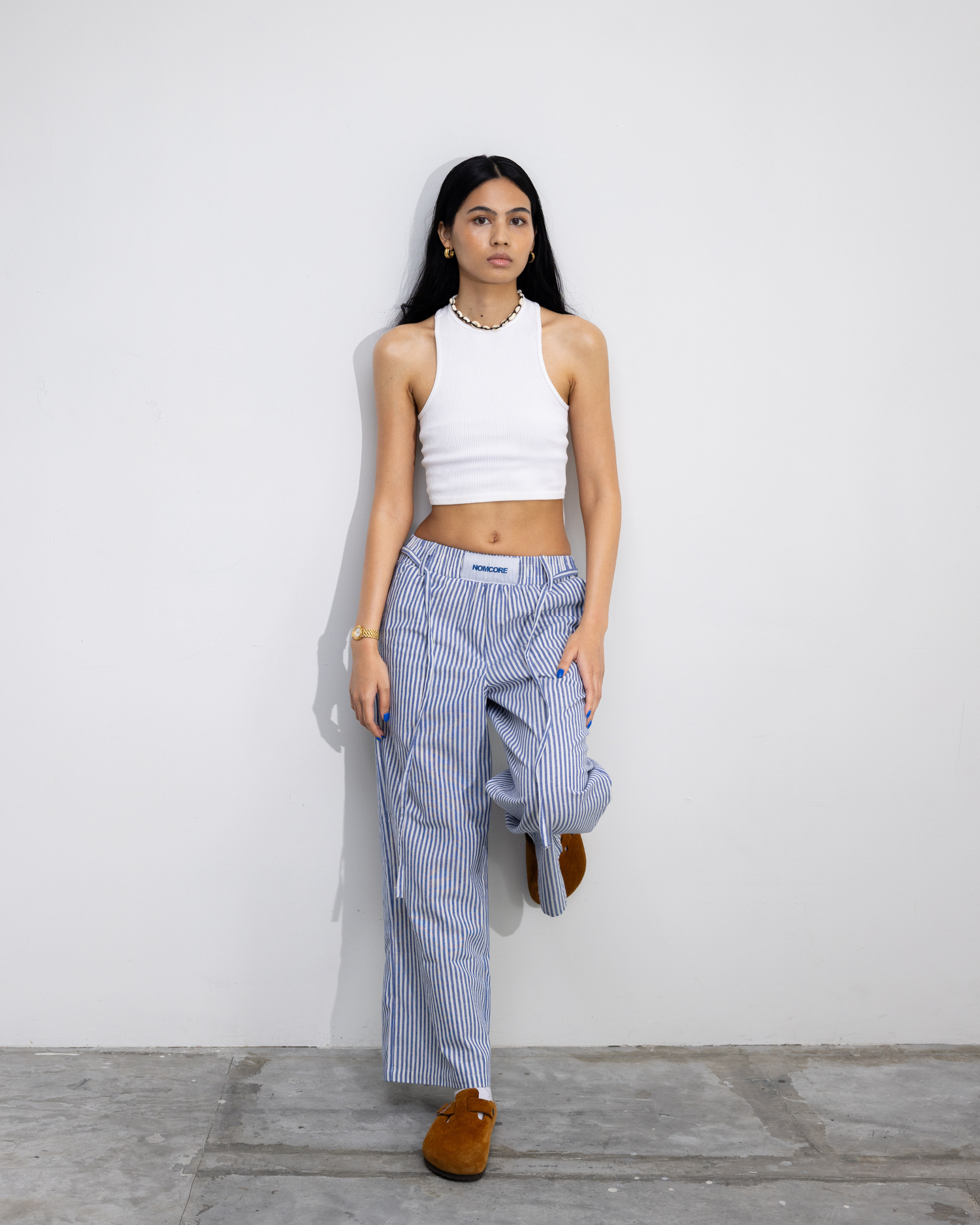 Oversized straight blue and white striped pants. Features an elastic waistband with a 'Nomcore' label on the exterior with a belt rope detail that can be styled in different ways.